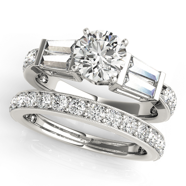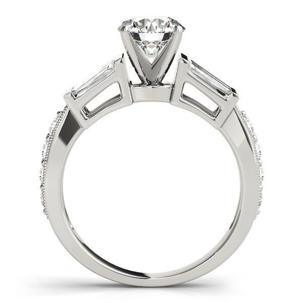 14k White Gold Engagement Ring with 4 – 5×2.5×1.75 Taper Baguette & 8 – .03PT Round Stones, equal to 1 carats total weight. This ring has an optional matching Wedding Band. Can be customized to fit any stone and in any material. Please contact Ronelli Corp for custom orders and modification information, as pricing may vary.