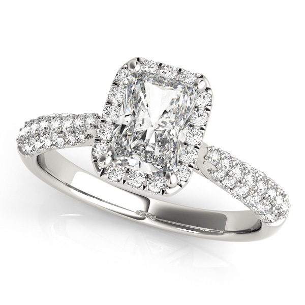 14k White Gold Engagement Ring with 1 – 10×8 Emerald & 8 – .004PT Round & 16 – .005PT Round & 38 – .0075PT Round Stones, equal to 2 3/8 carats total weight. This ring has an optional matching Wedding Band. Can be customized to fit any stone and in any material. Please contact Ronelli Corp for custom orders and modification information, as pricing may vary.