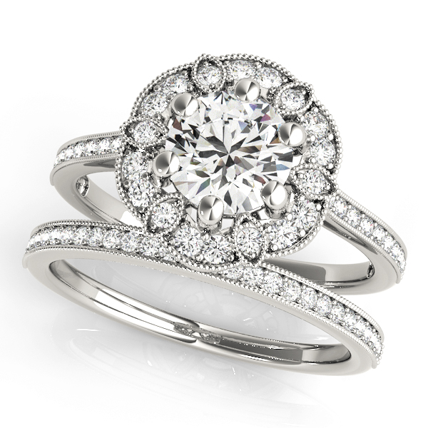14k White Gold Engagement Ring with 1 – 1.PT Round & 36 – .006PT Round Stones, equal to 1 1/5 carats total weight. This ring has an optional matching Wedding Band. Can be customized to fit any stone and in any material. Please contact Ronelli Corp for custom orders and modification information, as pricing may vary.