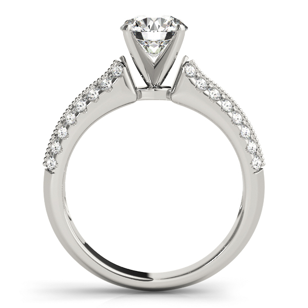 14k White Gold Engagement Ring with 32 – .015PT Round Stones, equal to 1/2 carats total weight. This ring has an optional matching Wedding Band. Can be customized to fit any stone and in any material. Please contact Ronelli Corp for custom orders and modification information, as pricing may vary.