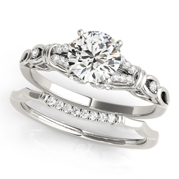 14k White Gold Engagement Ring with 24 – .005PT Round & 2 – .01PT Round Stones, equal to 1/8 carats total weight. This ring has an optional matching Wedding Band. Can be customized to fit any stone and in any material. Please contact Ronelli Corp for custom orders and modification information, as pricing may vary.