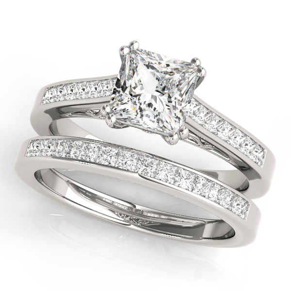 14k White Gold Engagement Ring with 1 – 6×6 Square & 12 – 1.5×1.5 Square Stones, equal to 1 1/4 carats total weight. This ring has an optional matching Wedding Band. Can be customized to fit any stone and in any material. Please contact Ronelli Corp for custom orders and modification information, as pricing may vary.
