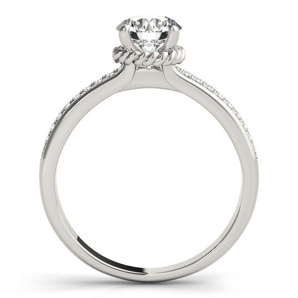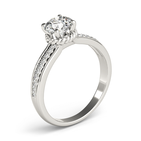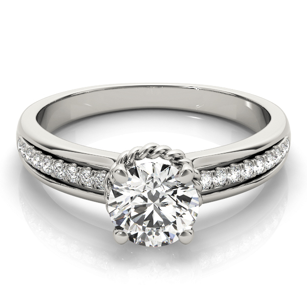14k White Gold Engagement Ring with 1 – .75PT Round & 23 – .006PT Round Stones, equal to 7/8 carats total weight. This ring has an optional matching Wedding Band. Can be customized to fit any stone and in any material. Please contact Ronelli Corp for custom orders and modification information, as pricing may vary.
