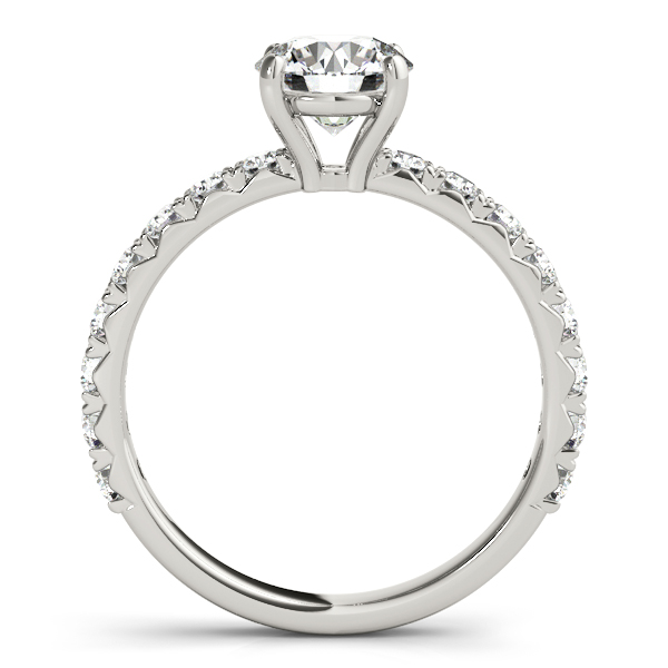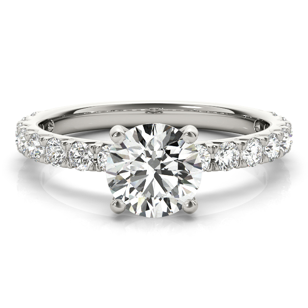 14k White Gold Engagement Ring with 1 – 1.PT Round & 16 – .03PT Round Stones, equal to 1 1/2 carats total weight. This ring has an optional matching Wedding Band. Can be customized to fit any stone and in any material. Please contact Ronelli Corp for custom orders and modification information, as pricing may vary.