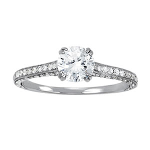 14k White Gold Engagement Ring with 1 – 1.PT Round & 34 – .0035PT Round & 54 – .005PT Round & 14 – .006PT Round Stones, equal to 1 1/2 carats total weight. This ring has an optional matching Wedding Band. Can be customized to fit any stone and in any material. Please contact Ronelli Corp for custom orders and modification information, as pricing may vary.