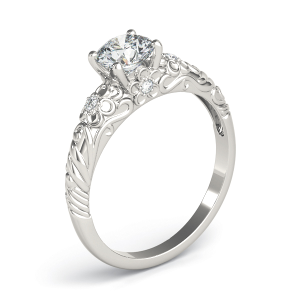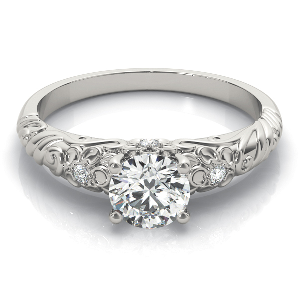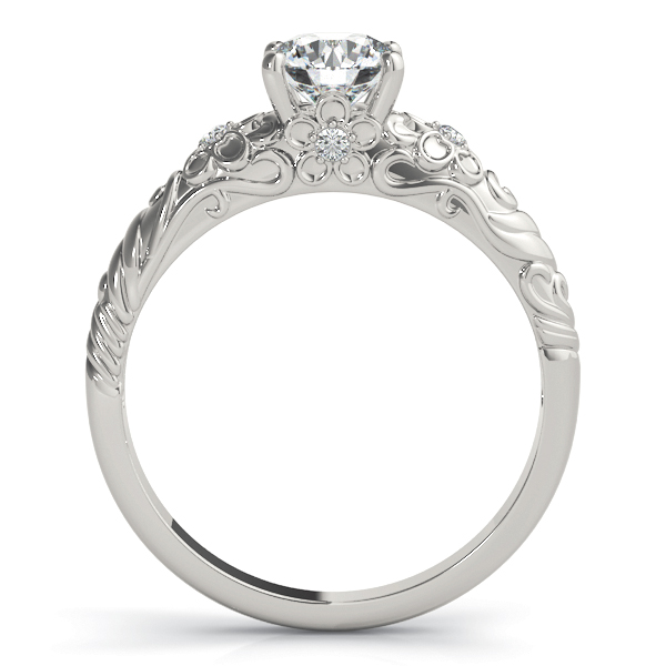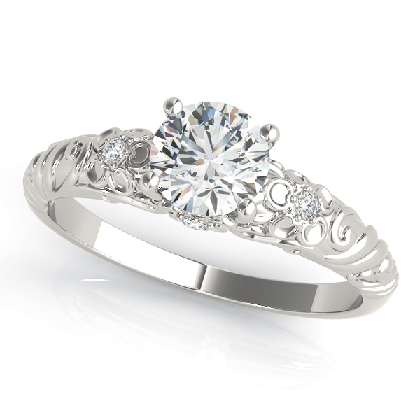 14k White Gold Engagement Ring with 1 – .5PT Round & 4 – .005PT Round Stones, equal to 1/2 carats total weight. This ring has an optional matching Wedding Band. Can be customized to fit any stone and in any material. Please contact Ronelli Corp for custom orders and modification information, as pricing may vary.