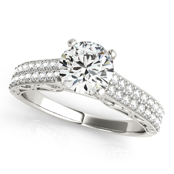 14k White Gold Engagement Ring with 36 – .01PT Round Stones, equal to 1/3 carats total weight. This ring has an optional matching Wedding Band. Can be customized to fit any stone and in any material. Please contact Ronelli Corp for custom orders and modification information, as pricing may vary.