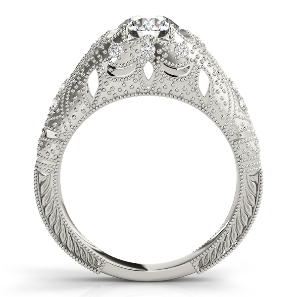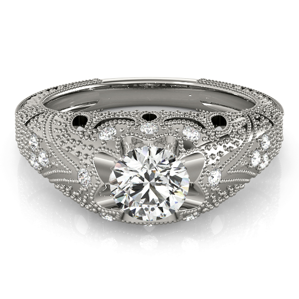 14k White Gold Engagement Ring with 1 – .75PT Round & 14 – .01PT Round Stones, equal to 7/8 carats total weight. This ring has an optional matching Wedding Band. Can be customized to fit any stone and in any material. Please contact Ronelli Corp for custom orders and modification information, as pricing may vary.