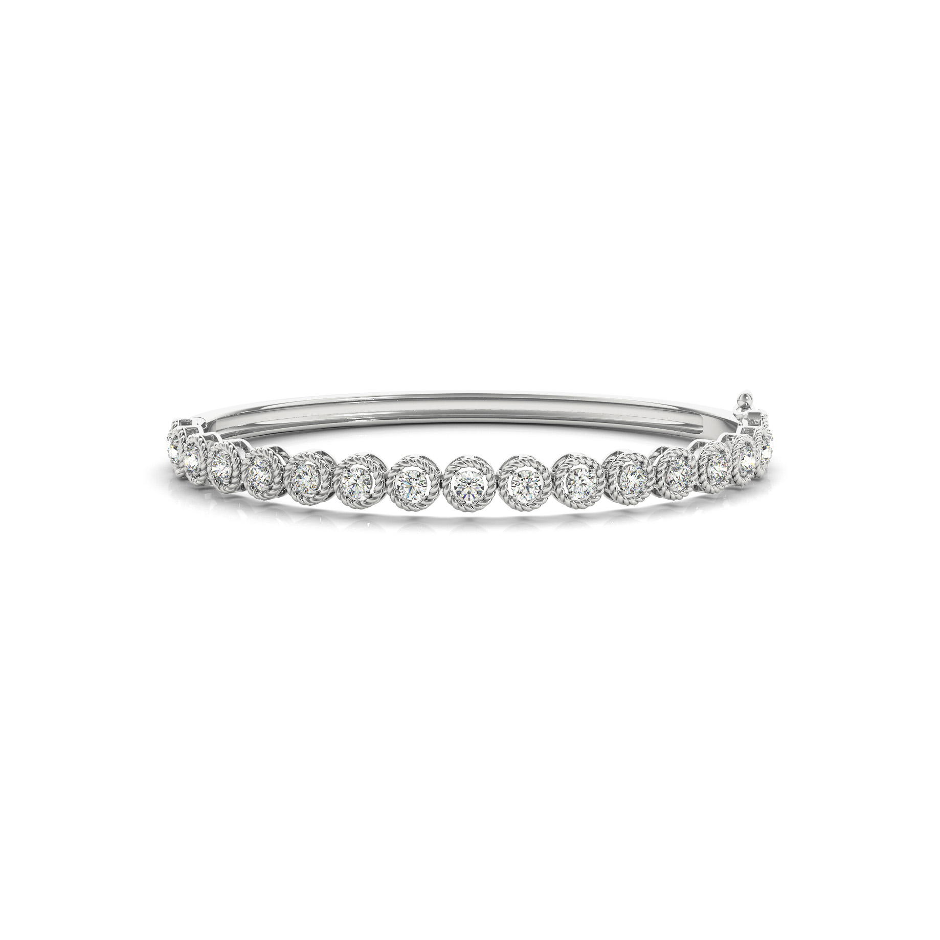 14k White Gold Bracelet with 23 – .025PT Round Stones, equal to 5/8 carats total weight. Can be customized to fit any stone and in any material. Please contact Ronelli Corp for custom orders and modification information, as pricing may vary.