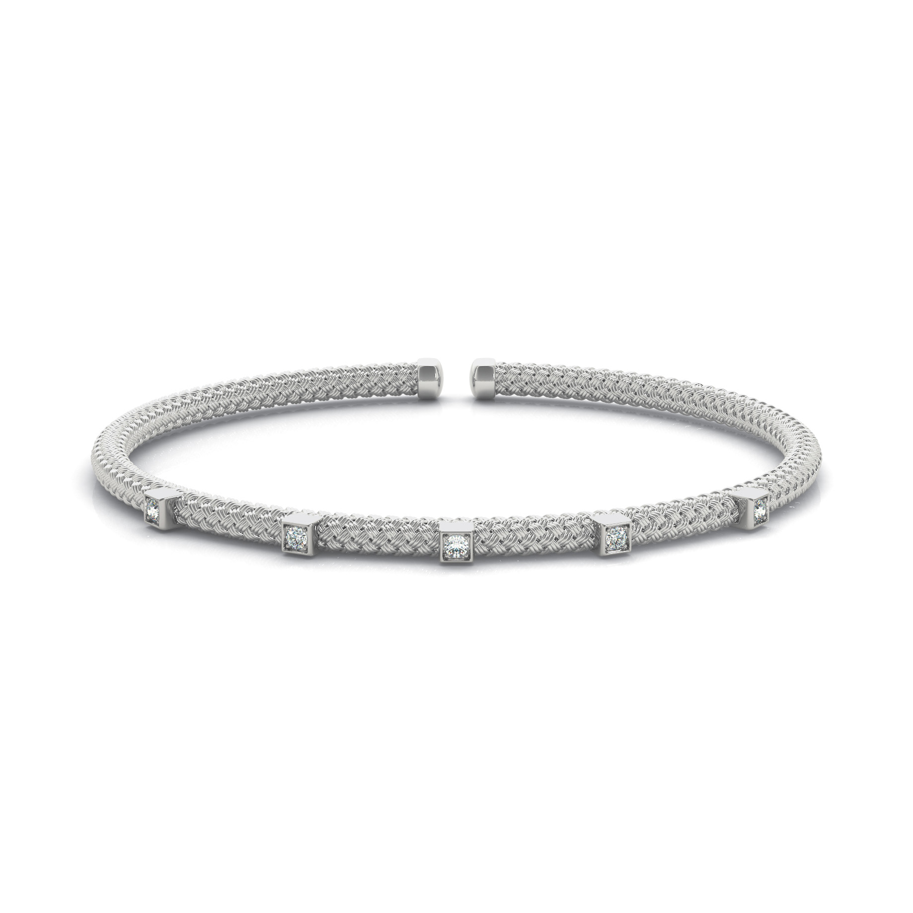 14k White Gold Bracelet with 5 – .03PT Round Stones, equal to 1/6 carats total weight. Can be customized to fit any stone and in any material. Please contact Ronelli Corp for custom orders and modification information, as pricing may vary.