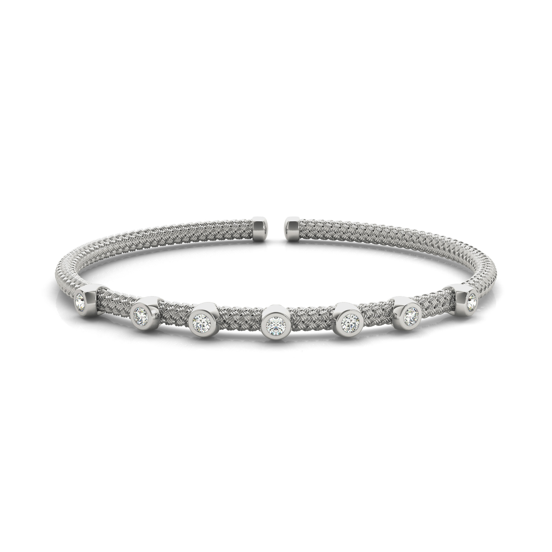 14k White Gold Bracelet with 7 – .015PT Round Stones, equal to 1/10 carats total weight. Can be customized to fit any stone and in any material. Please contact Ronelli Corp for custom orders and modification information, as pricing may vary.