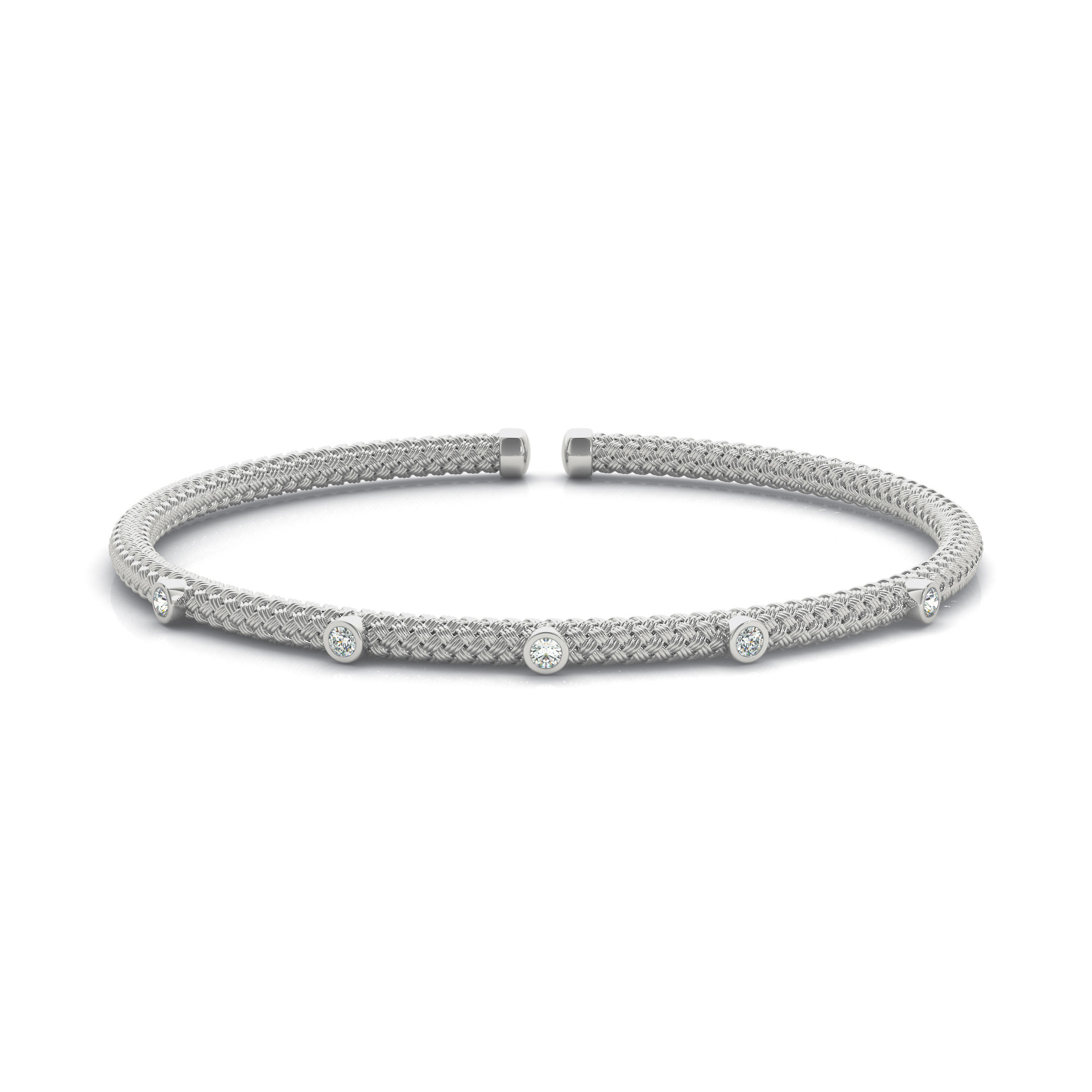 14k White Gold Bracelet with 5 – .02PT Round Stones, equal to 1/10 carats total weight. Can be customized to fit any stone and in any material. Please contact Ronelli Corp for custom orders and modification information, as pricing may vary.