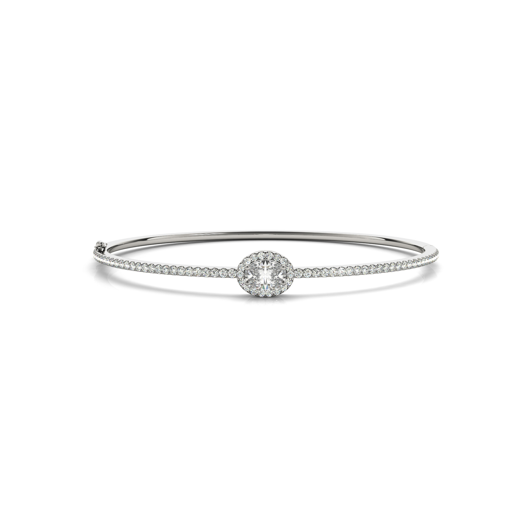 14k White Gold Bracelet with 1 – 7×5 Oval & 72 – .01PT Round Stones, equal to 1 5/8 carats total weight. Can be customized to fit any stone and in any material. Please contact Ronelli Corp for custom orders and modification information, as pricing may vary.