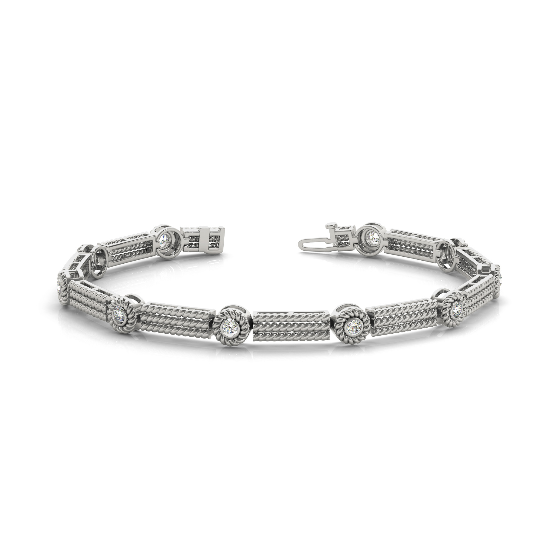 14k White Gold Bracelet with 10 – .07PT Round Stones, equal to 3/4 carats total weight. Can be customized to fit any stone and in any material. Please contact Ronelli Corp for custom orders and modification information, as pricing may vary.