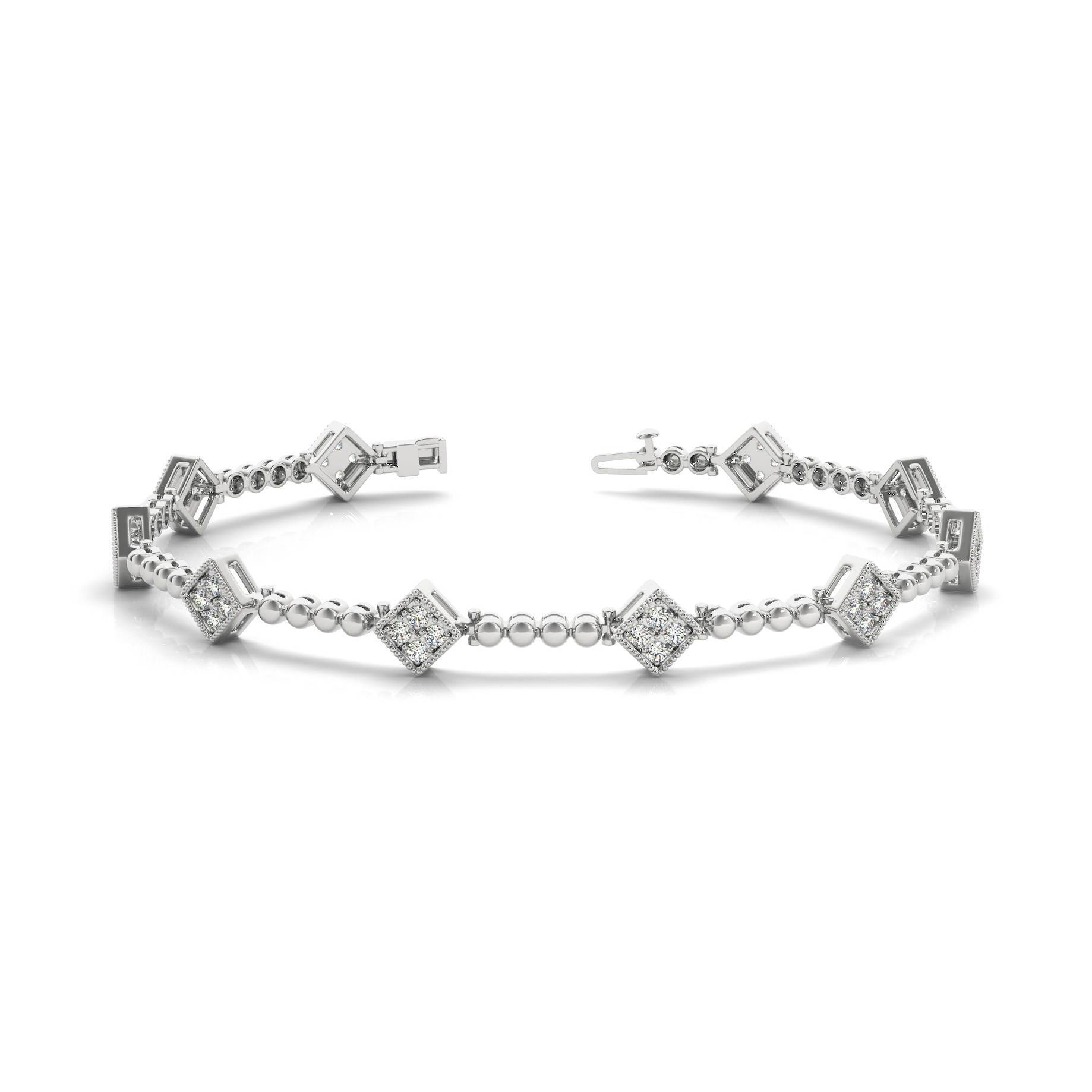14k White Gold Bracelet with 40 – .01PT Round Stones, equal to 3/8 carats total weight. Can be customized to fit any stone and in any material. Please contact Ronelli Corp for custom orders and modification information, as pricing may vary.