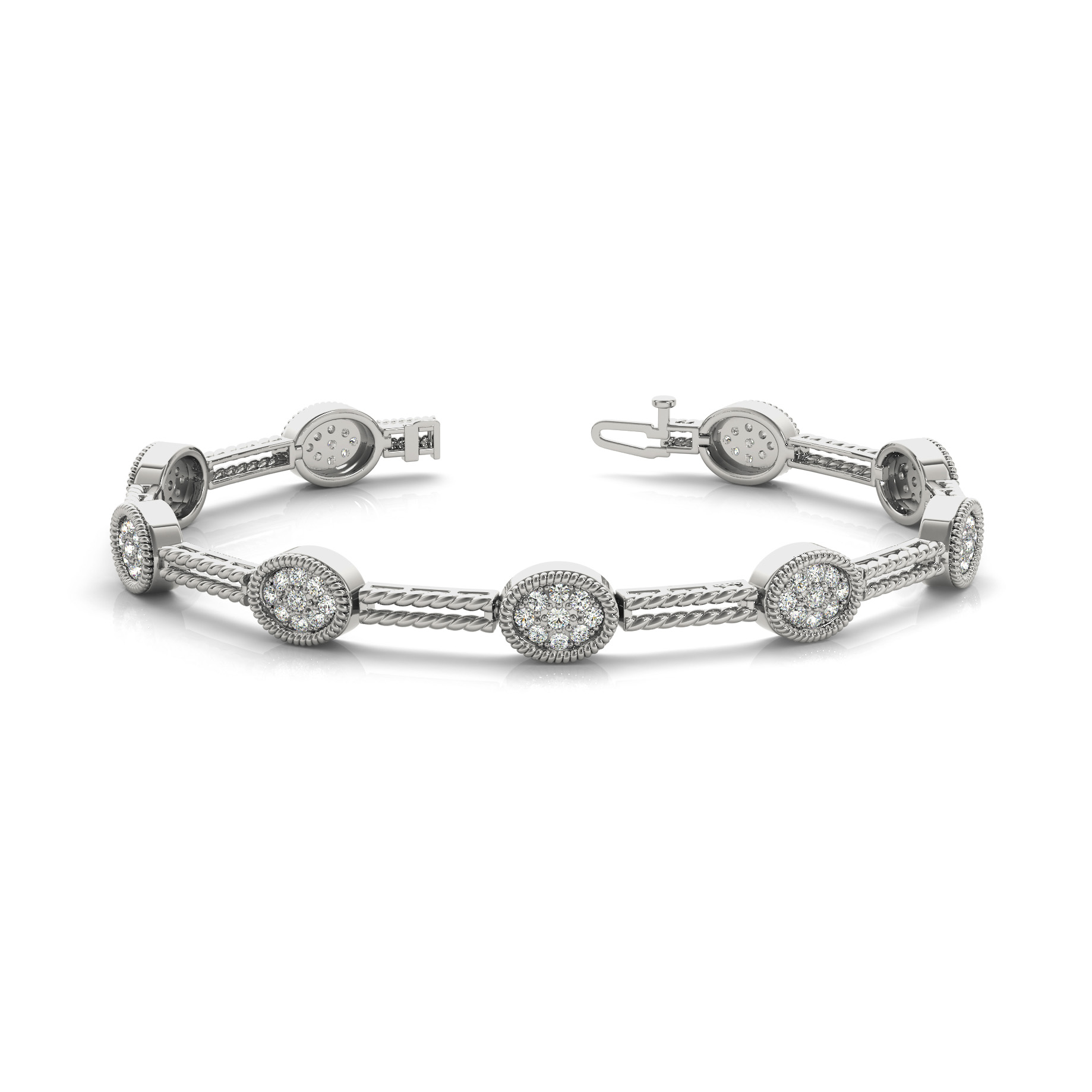 14k White Gold Bracelet with 9 – .02PT Round & 72 – .015PT Round Stones, equal to 1 1/4 carats total weight. Can be customized to fit any stone and in any material. Please contact Ronelli Corp for custom orders and modification information, as pricing may vary.