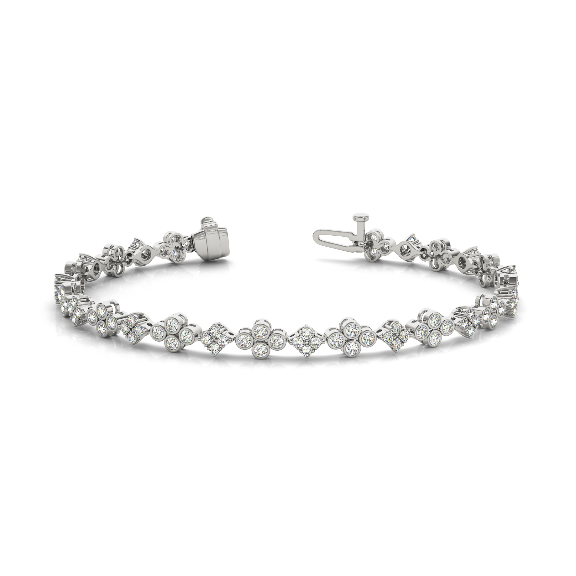 14k White Gold Bracelet with 112 – .0125PT Round Stones, equal to 1 3/8 carats total weight. Can be customized to fit any stone and in any material. Please contact Ronelli Corp for custom orders and modification information, as pricing may vary.