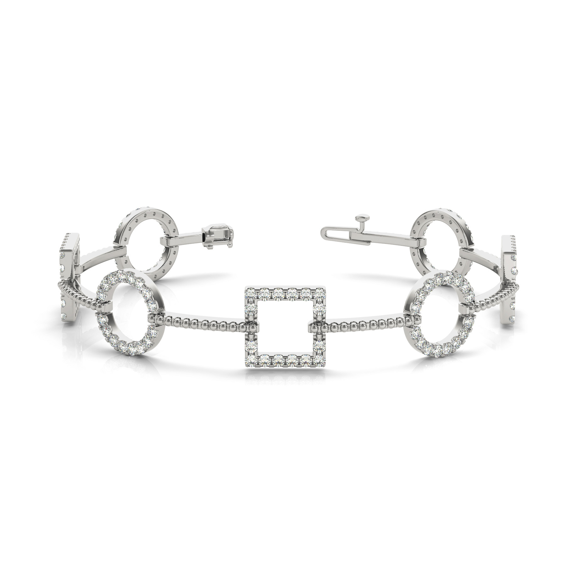 14k White Gold Bracelet with 112 – .01PT Round Stones, equal to 1 1/8 carats total weight. Can be customized to fit any stone and in any material. Please contact Ronelli Corp for custom orders and modification information, as pricing may vary.