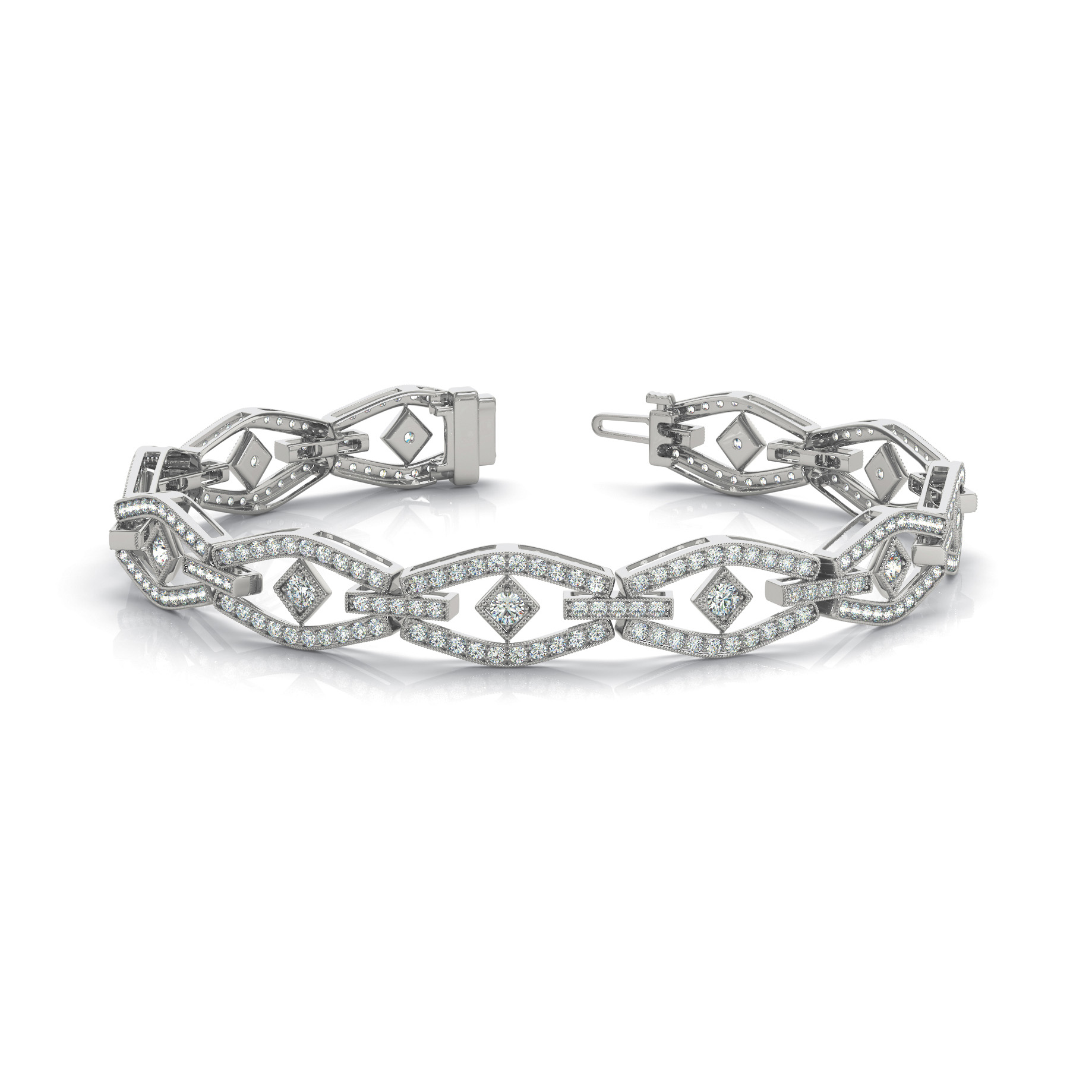 14k White Gold Bracelet with 274 – .01PT Round & 11 – .03PT Round Stones, equal to 3 carats total weight. Can be customized to fit any stone and in any material. Please contact Ronelli Corp for custom orders and modification information, as pricing may vary.