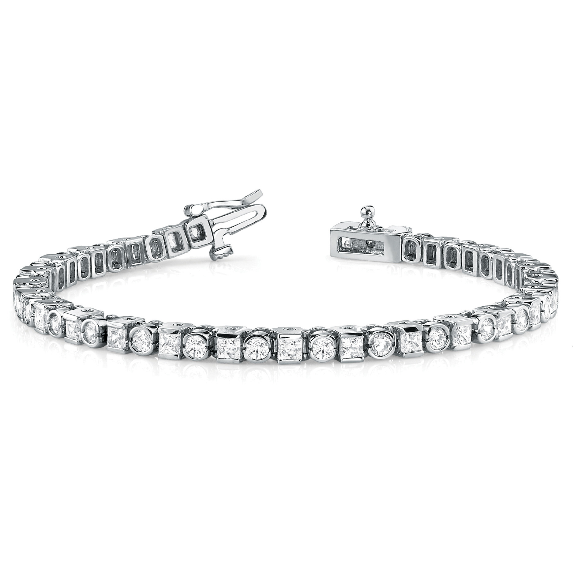 14k White Gold Bracelet with 27 – 2.5×2.5 Square & 27 – .05PT Round Stones, equal to 4 carats total weight. Can be customized to fit any stone and in any material. Please contact Ronelli Corp for custom orders and modification information, as pricing may vary.
