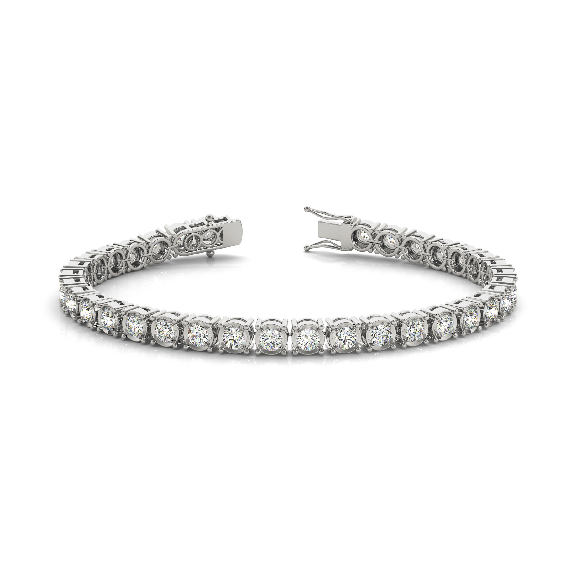 14k White Gold Bracelet with 46 – .0175PT Round Stones, equal to 3/4 carats total weight. Can be customized to fit any stone and in any material. Please contact Ronelli Corp for custom orders and modification information, as pricing may vary.