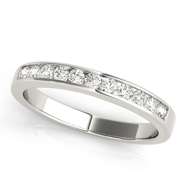 14k White Gold Wedding Band with 11 – .025PT Round Stones, equal to 1/4 carats total weight. Can be customized to fit any stone and in any material. Please contact Ronelli Corp for custom orders and modification information, as pricing may vary.