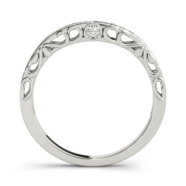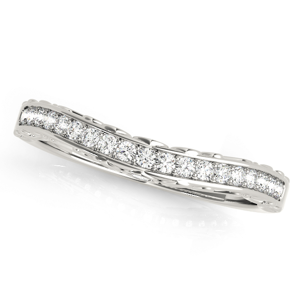 14k White Gold Wedding Band with 17 – .0125PT Round & 2 – .014PT Round Stones, equal to 1/4 carats total weight. This ring has an optional matching Engagement Ring. Can be customized to fit any stone and in any material. Please contact Ronelli Corp for custom orders and modification information, as pricing may vary.