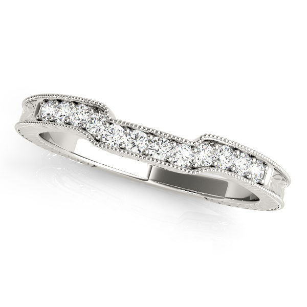 14k White Gold Wedding Band with 12 – .01PT Round Stones, equal to 1/8 carats total weight. This ring has an optional matching Engagement Ring. Can be customized to fit any stone and in any material. Please contact Ronelli Corp for custom orders and modification information, as pricing may vary.