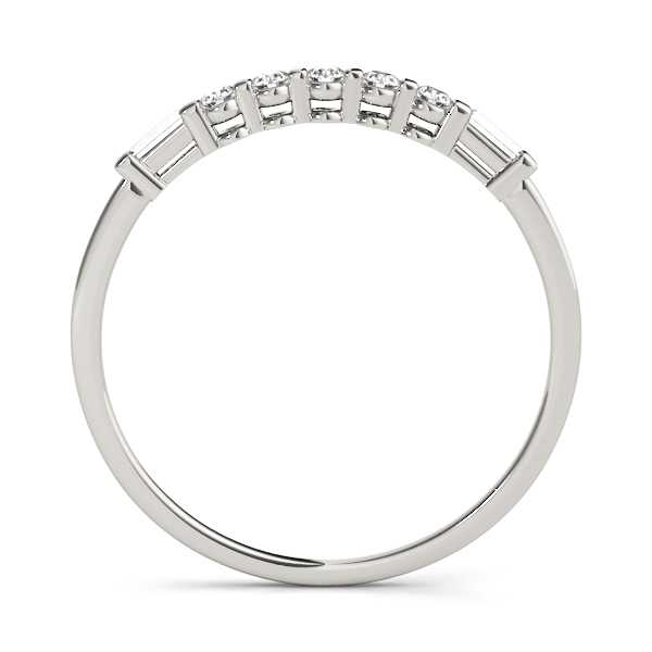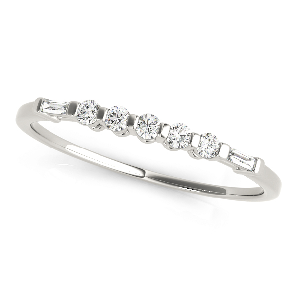 14k White Gold Wedding Band with 5 – .02PT Round & 2 – 2.5×1 Straight Baguette Stones, equal to 1/8 carats total weight. This ring has an optional matching Engagement Ring. Can be customized to fit any stone and in any material. Please contact Ronelli Corp for custom orders and modification information, as pricing may vary.