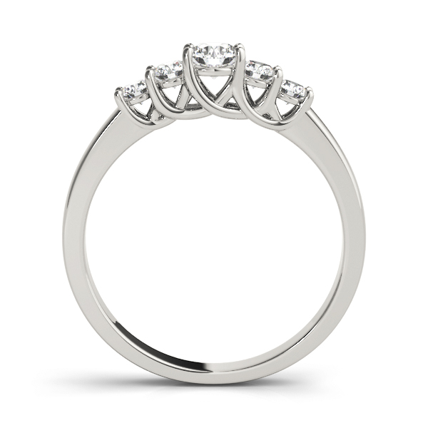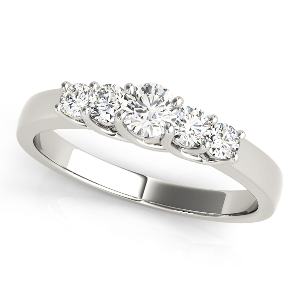 14k White Gold Wedding Band with 1 – .5PT Round & 2 – .15PT Round & 2 – .1PT Round Stones, equal to 1 carats total weight. Can be customized to fit any stone and in any material. Please contact Ronelli Corp for custom orders and modification information, as pricing may vary.