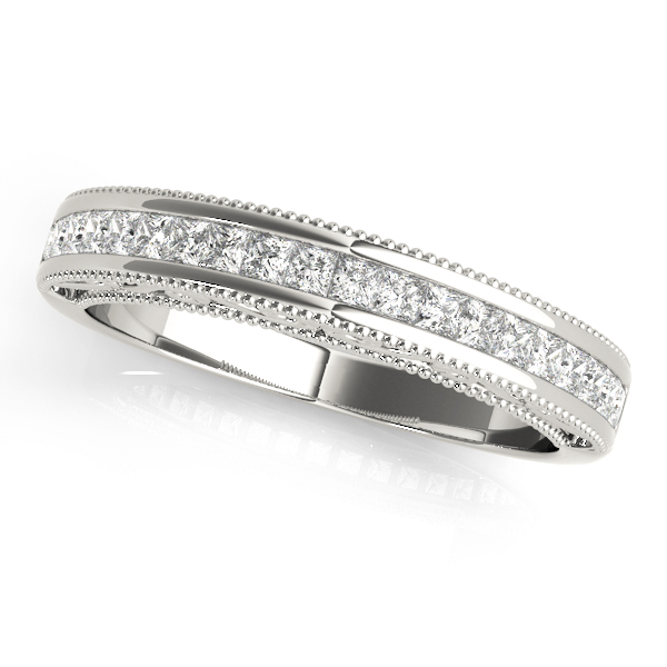 14k White Gold Wedding Band with 20 – 1.5×1.5 Square Stones, equal to 3/8 carats total weight. This ring has an optional matching Engagement Ring. Can be customized to fit any stone and in any material. Please contact Ronelli Corp for custom orders and modification information, as pricing may vary.