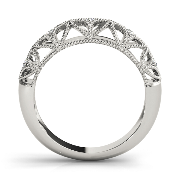14k White Gold Wedding Band with 2 – .01PT Round & 3 – .02PT Round Stones, equal to 1/15 carats total weight. This ring has an optional matching Engagement Ring. Can be customized to fit any stone and in any material. Please contact Ronelli Corp for custom orders and modification information, as pricing may vary.