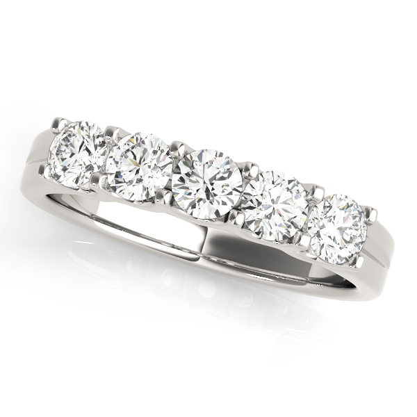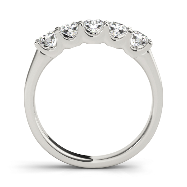 14k White Gold Wedding Band with 5 – .15PT Round Stones, equal to 3/4 carats total weight. This ring has an optional matching Engagement Ring. Can be customized to fit any stone and in any material. Please contact Ronelli Corp for custom orders and modification information, as pricing may vary.