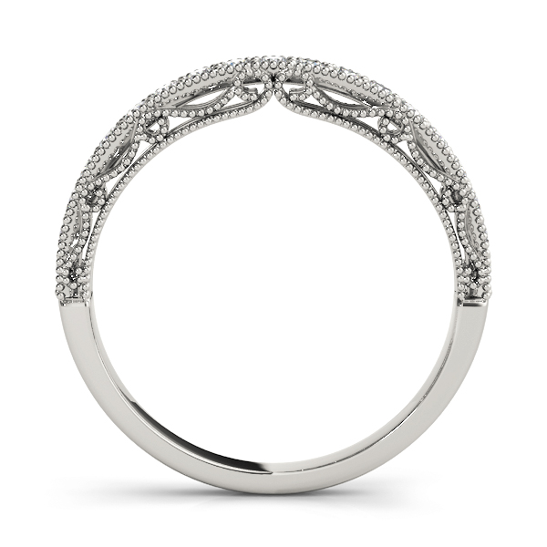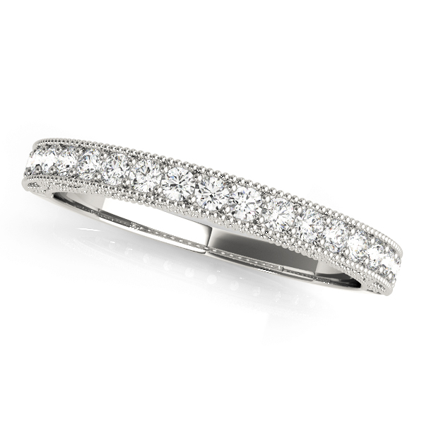 14k White Gold Wedding Band with 19 – .015PT Round Stones, equal to 1/3 carats total weight. This ring has an optional matching Engagement Ring. Can be customized to fit any stone and in any material. Please contact Ronelli Corp for custom orders and modification information, as pricing may vary.