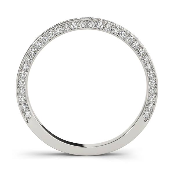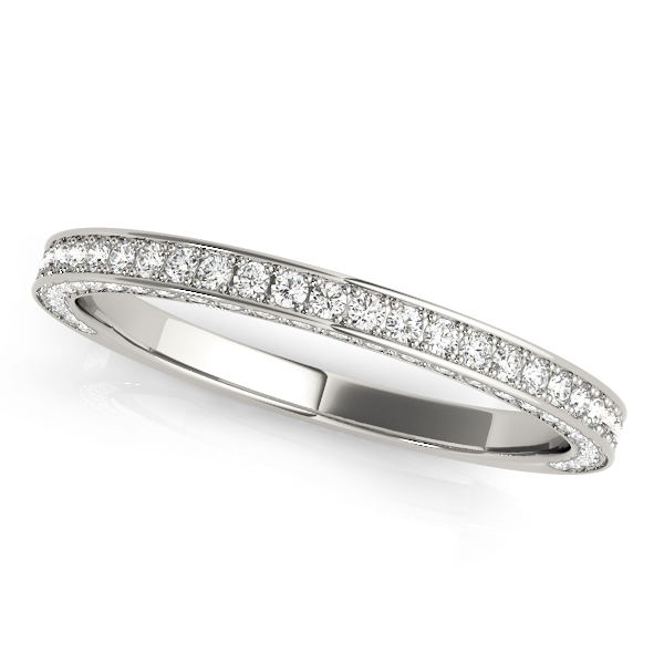 14k White Gold Wedding Band with 28 – .004PT Round & 69 – .005PT Round Stones, equal to 1/2 carats total weight. This ring has an optional matching Engagement Ring. Can be customized to fit any stone and in any material. Please contact Ronelli Corp for custom orders and modification information, as pricing may vary.