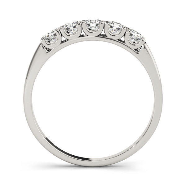 14k White Gold Wedding Band with 5 – .02PT Round Stones, equal to 1/10 carats total weight. This ring has an optional matching Engagement Ring. Can be customized to fit any stone and in any material. Please contact Ronelli Corp for custom orders and modification information, as pricing may vary.