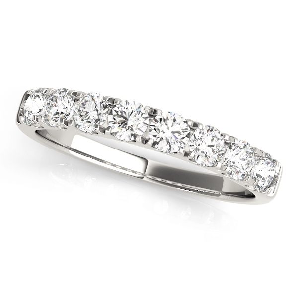14k White Gold Wedding Band with 8 – .09PT Round Stones, equal to 3/4 carats total weight. This ring has an optional matching Engagement Ring. Can be customized to fit any stone and in any material. Please contact Ronelli Corp for custom orders and modification information, as pricing may vary.