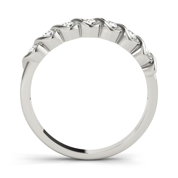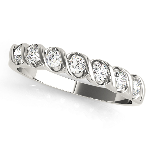 14k White Gold Wedding Band with 7 – .04PT Round Stones, equal to 1/4 carats total weight. This ring has an optional matching Engagement Ring. Can be customized to fit any stone and in any material. Please contact Ronelli Corp for custom orders and modification information, as pricing may vary.