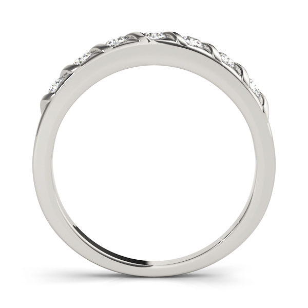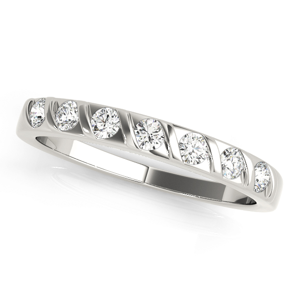 14k White Gold Wedding Band with 7 – .04PT Round Stones, equal to 1/4 carats total weight. This ring has an optional matching Engagement Ring. Can be customized to fit any stone and in any material. Please contact Ronelli Corp for custom orders and modification information, as pricing may vary.