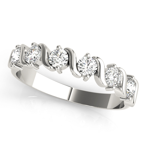 14k White Gold Wedding Band with 6 – .06PT Round Stones, equal to 1/3 carats total weight. Can be customized to fit any stone and in any material. Please contact Ronelli Corp for custom orders and modification information, as pricing may vary.
