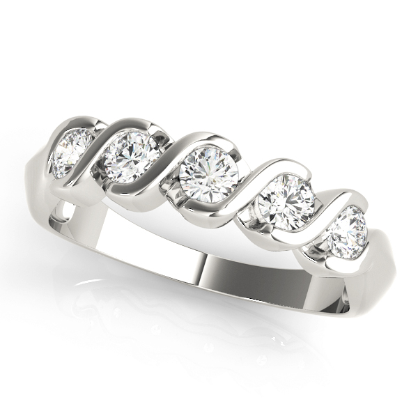 14k White Gold Wedding Band with 5 – .2PT Round Stones, equal to 1 carats total weight. Can be customized to fit any stone and in any material. Please contact Ronelli Corp for custom orders and modification information, as pricing may vary.