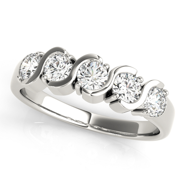 14k White Gold Wedding Band with 5 – .2PT Round Stones, equal to 1 carats total weight. Can be customized to fit any stone and in any material. Please contact Ronelli Corp for custom orders and modification information, as pricing may vary.