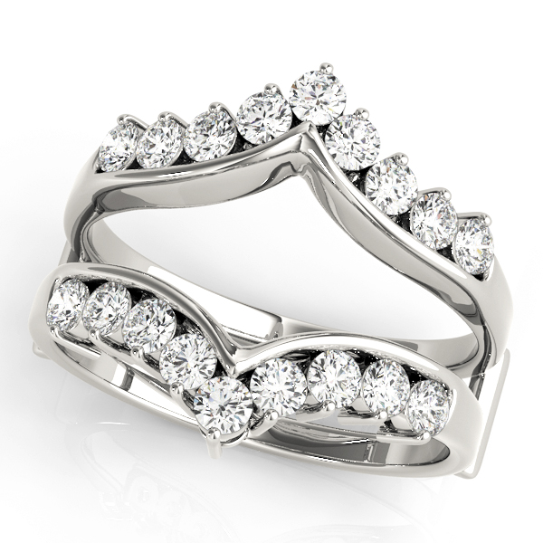 14k White Gold Wedding Band with 18 – .03PT Round Stones, equal to 1/2 carats total weight. Can be customized to fit any stone and in any material. Please contact Ronelli Corp for custom orders and modification information, as pricing may vary.